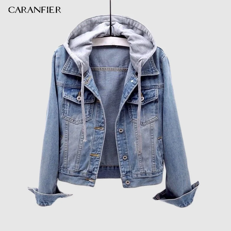 price reduction CARANFIER 2019 European Plus Europ Size Short Denim Jacket Autumn Fashion Bomber Denim Hooded Jacke